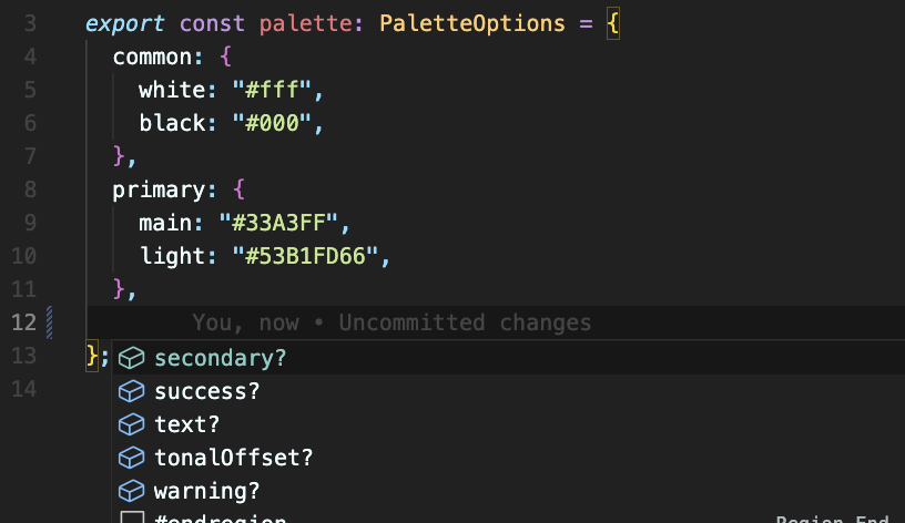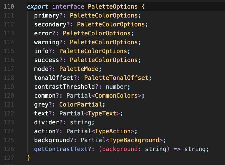 }How did I know about PaletteColorOptions ? it’s not a magic, I clicked on PaletteOptions and checked the type for the already existing colors schema.